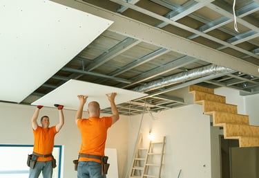 Malujemy ściany i sufity farbami dopasowanymi do pomieszczeń oraz wykonujemy zabudowy z płyt g-k: sufity podwieszane, zabudowy instalacji, ścianki działowe i wnęki pod oświetlenie.