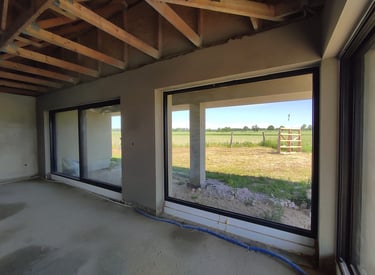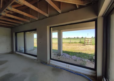 Wykonanie trwałych tynków cementowo-wapiennych na dużych powierzchniach z przeszkleniami, gotowych do nałożenia gładzi.