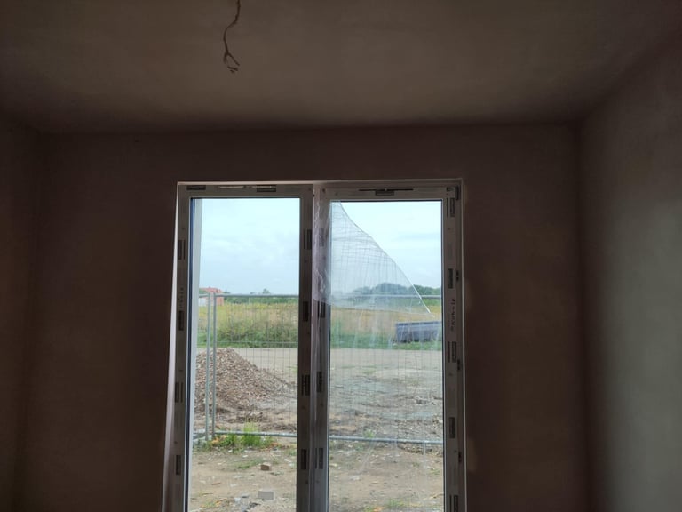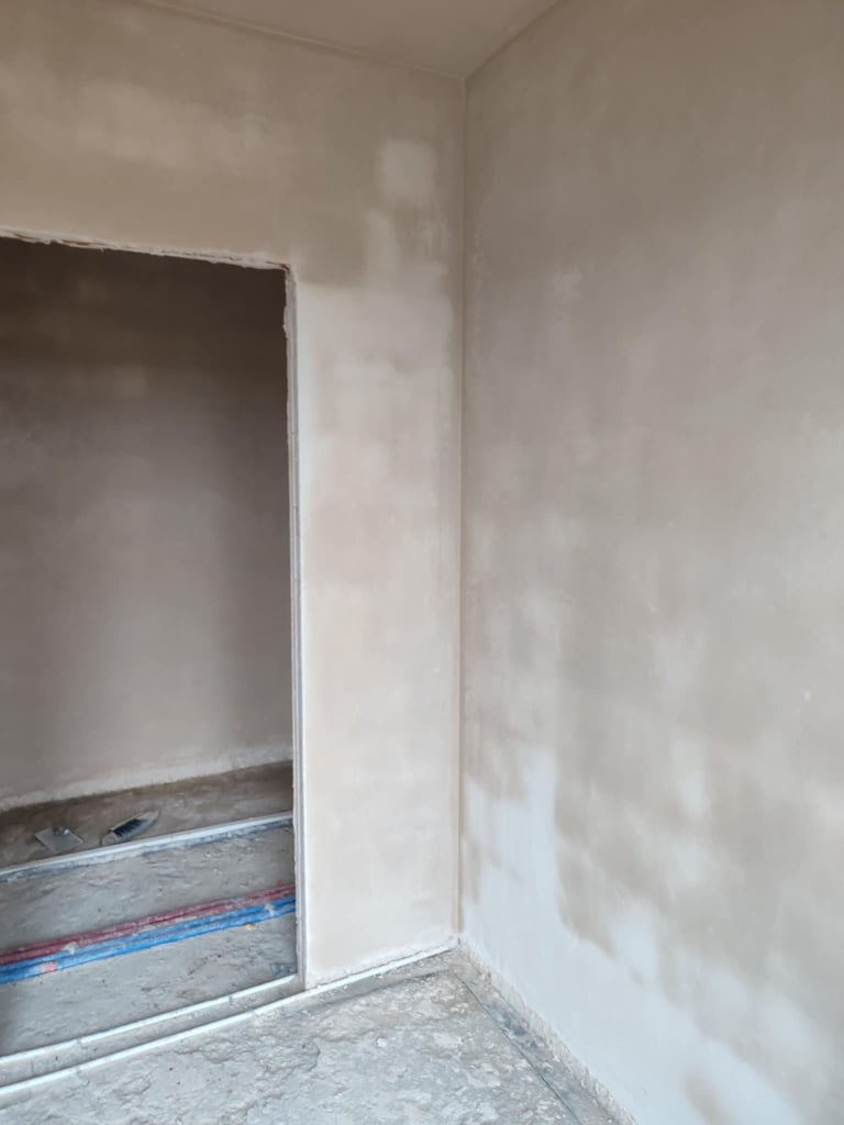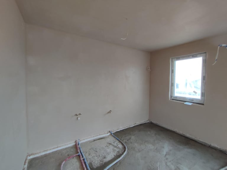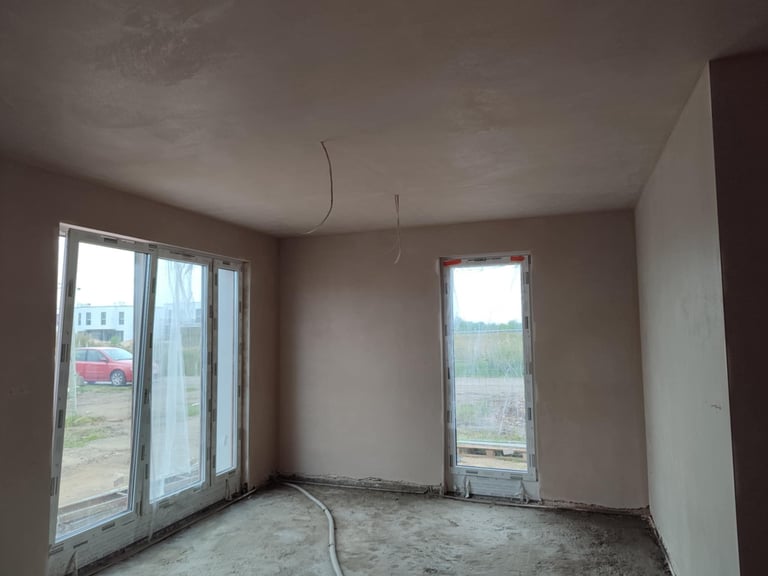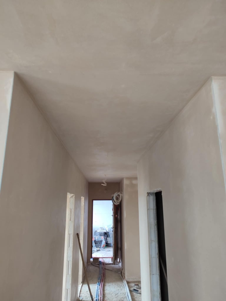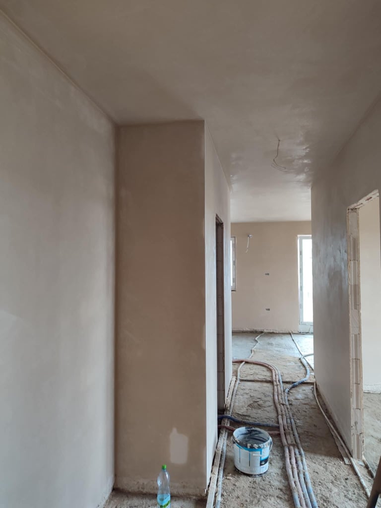 W ramach tej inwestycji wykonaliśmy kompleksowe tynkowanie ścian metodą maszynową, z wykorzystaniem niezawodnego agregatu tynkarskiego PFT G4. Prace obejmowały aplikację tynku cementowo-wapiennego, który po wyschnięciu został pomalowany bez konieczności dodatkowego wygładzania powierzchni.