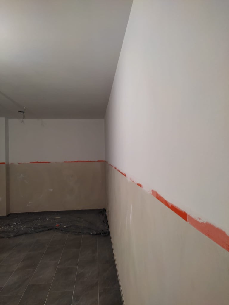 Na zdjęciach przedstawiono proces malowania dwukolorowego, w którym wyraźnie oddzielone zostały dolne i górne partie ścian. Wykorzystaliśmy wytrzymałe taśmy zabezpieczające, by uzyskać idealnie prostą linię odcięcia kolorów, co przekłada się na estetyczny efekt końcowy.